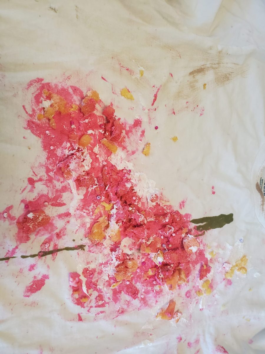 Additive distressing to mimic dropped birthday cake and other stains.