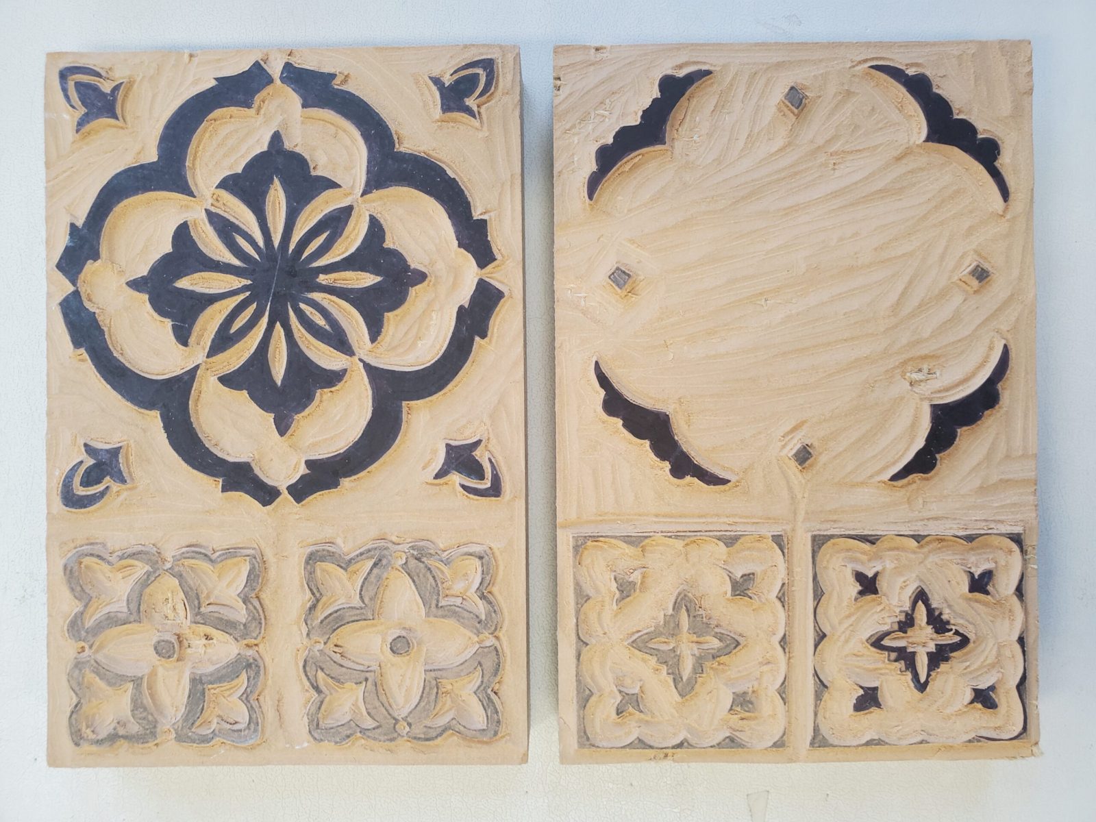 Yardage printed from 2 carved blocks. Inspired by Portuguese tile.