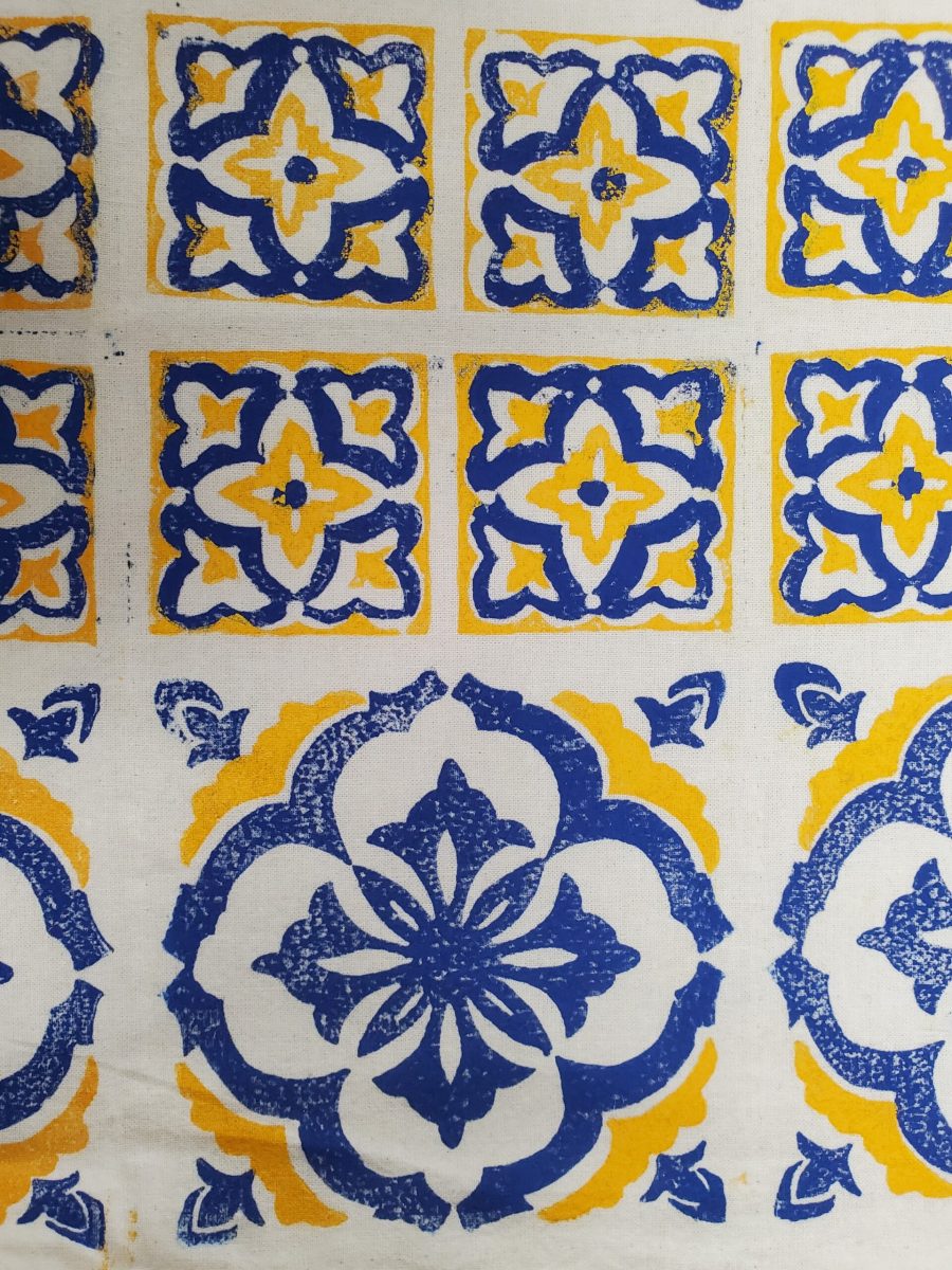Yardage printed from 2 carved blocks. Inspired by Portuguese tile.