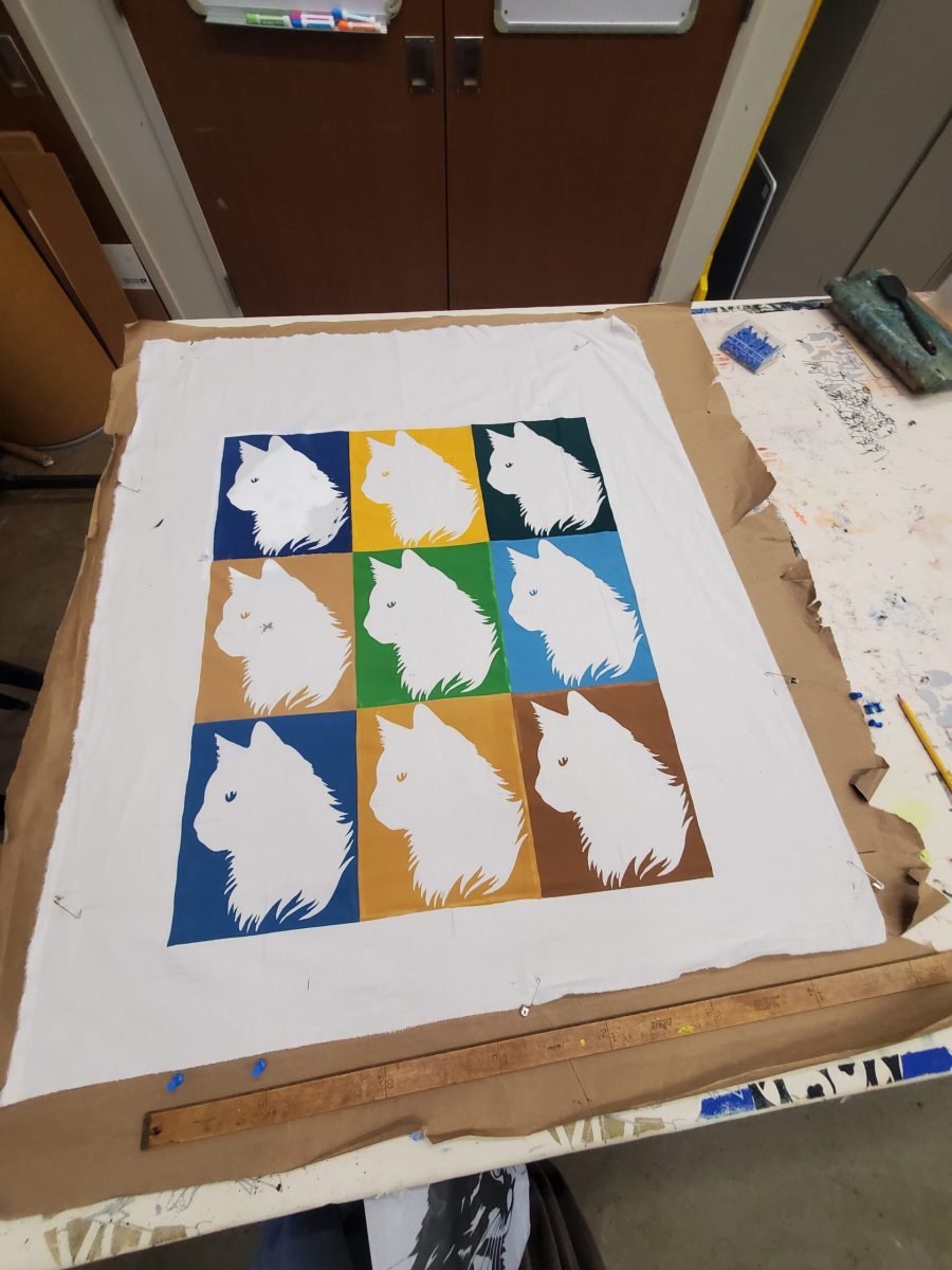 Screen print made with two screens. One screen made with photo exposure, the other with screen filler.