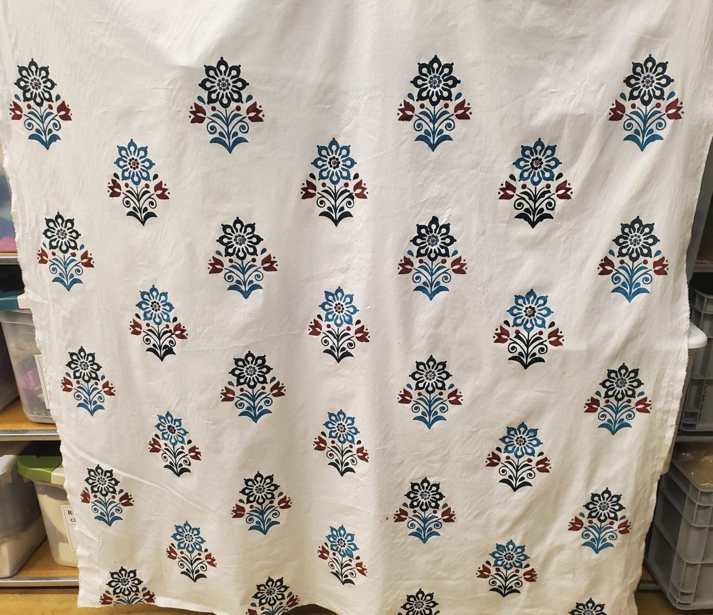 Yardage printed by registering a 3-piece stencil. Stencil cut with a craft cutting machine. Inspired by Scandinavian folk patterns.