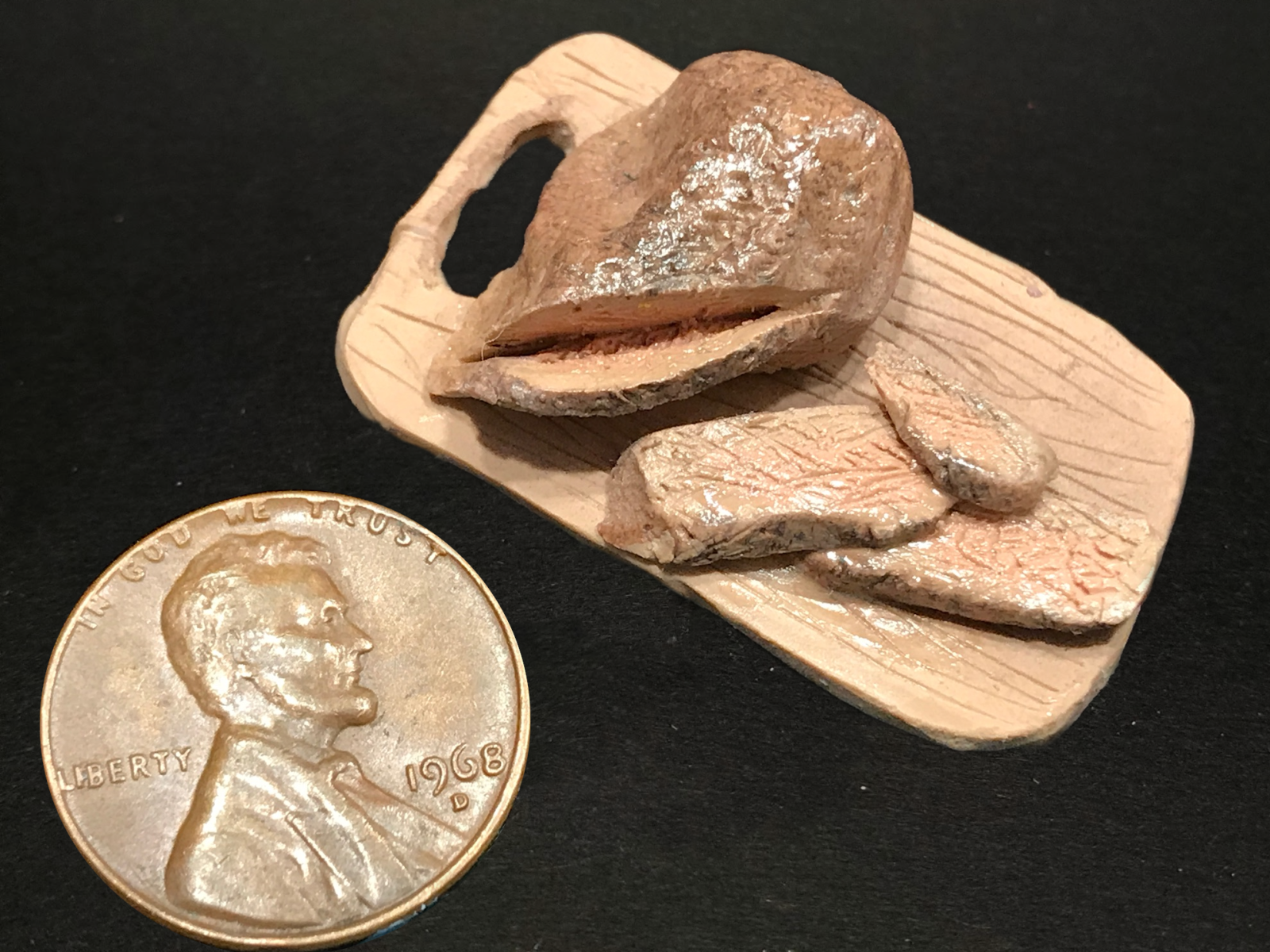 Miniature food sculpted from polymer clay. Roughly 1:12 scale.